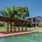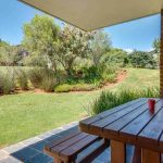 The covered patio has an 8-seater bench where guests can relax and enjoy the outdoors. The pool is only a few metres from the patio.